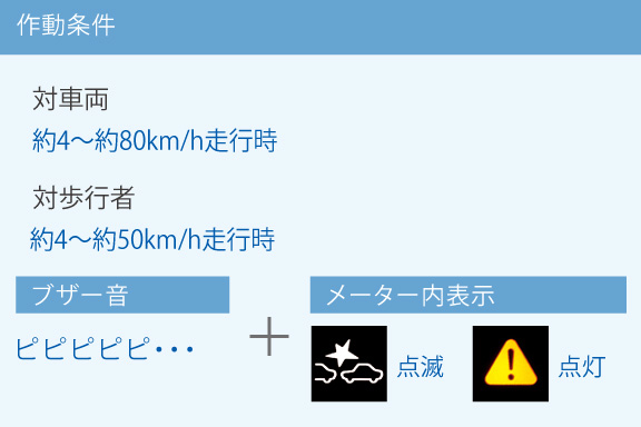 ■対車両の場合は前方約60m以内で検知し、対歩行者の場合は前方約30m以内で検知します。また、作動したときの速度差が約4~約30km/hであれば衝突を回避できる場合があり、速度差が約30~約80km/h(対歩行者の場合は約30~約50km/h)であれば被害を軽減できる場合があります。