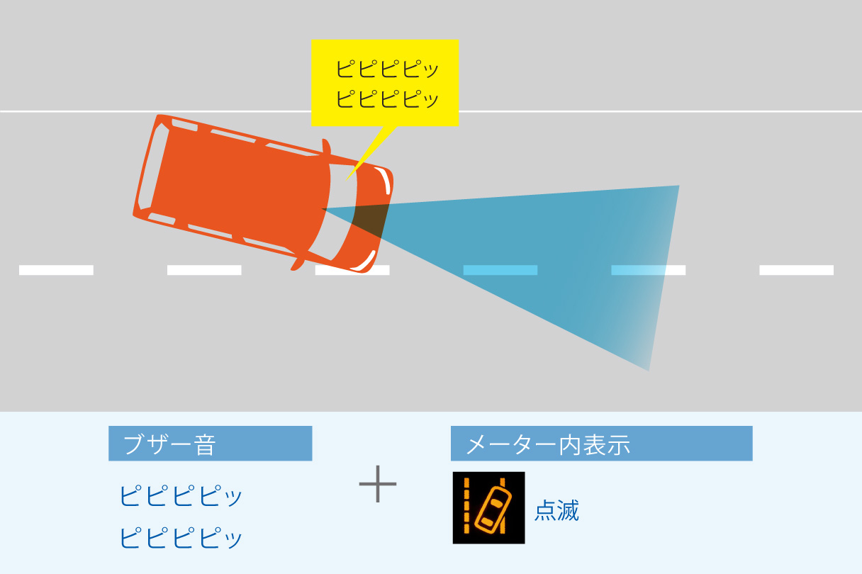 約60km/h以上で走行中にステレオカメラが車線を検知している場合、道路上の車線から逸脱しそうになると、ドライバーへ警報し、逸脱回避操作を促します。
